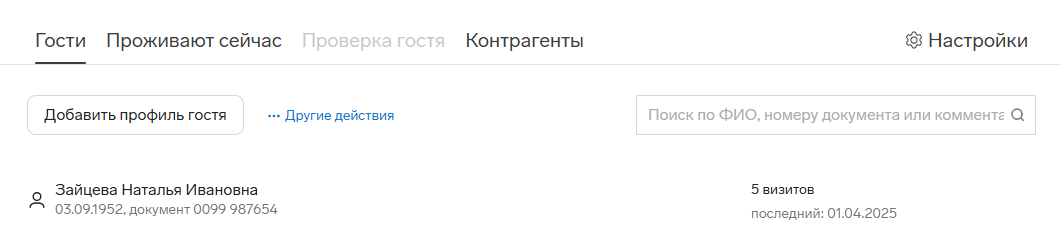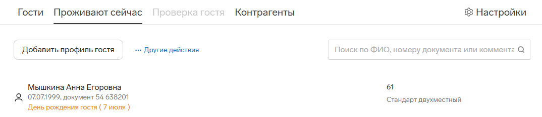 На всех вкладках можно быстро найти гостя или контрагента в поле поиска. Начните вводить ФИО, номер документа или комментарий и выберите гостя в появившемся списке. Аналогично на вкладке «Контрагенты» работает поиск по названию или ИНН.