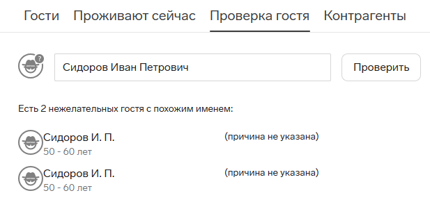 Эта проверка делается по ФИО гостей, которые были отмечены в других отелях как нежелательные. Обратите внимание, что поиск идет только по ФИО, поэтому могут быть найдены тезки.