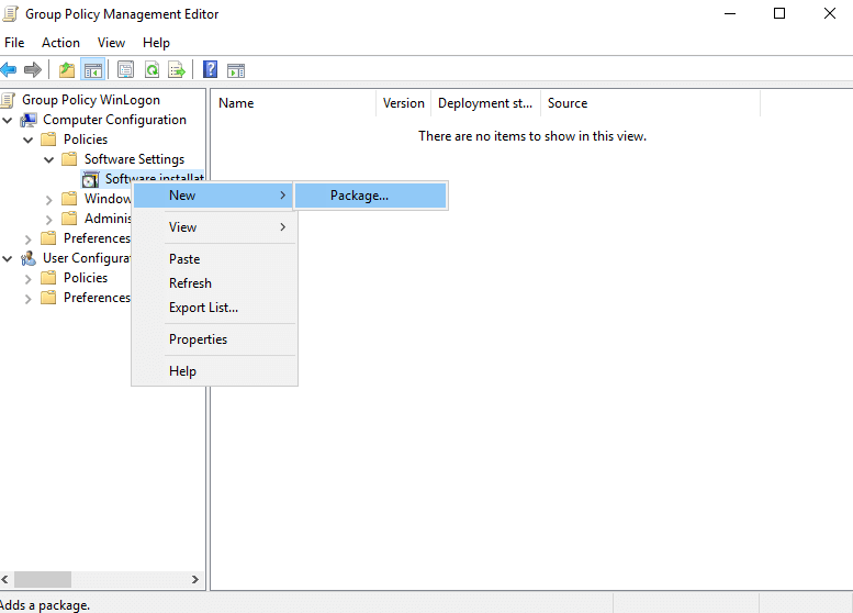 В дереве настроек, расположенном в левой части окна, нажмите правой кнопкой мыши на пункте «Computer Configuration» → «Policies» → «Software Settings» → «Software installation».