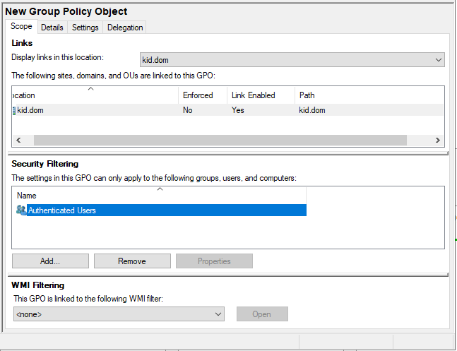 - Перейдите в политику. Выберите значение по умолчанию и в разделе «Security Filtering» нажмите «Remove».