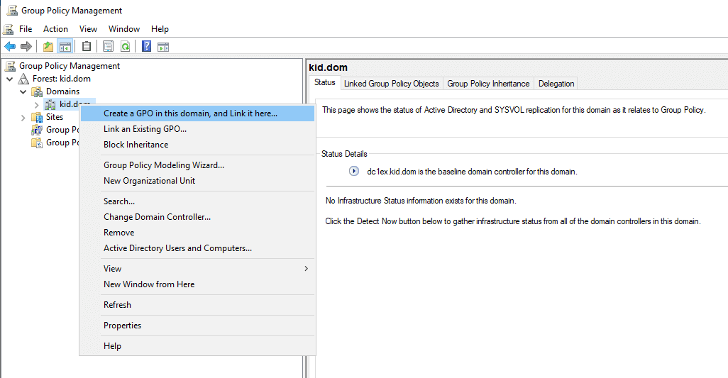 - Создайте новый объект групповой политики (GPO, Group Policy Object). Нажмите правой кнопкой мыши на домен и в появившемся меню выберите пункт «Create a GPO in this domain, and link in here».