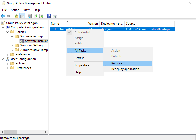 Настройки GPO обновятся, и приложение будет удалено на клиентских машинах во время следующего входа пользователей в учётные записи.