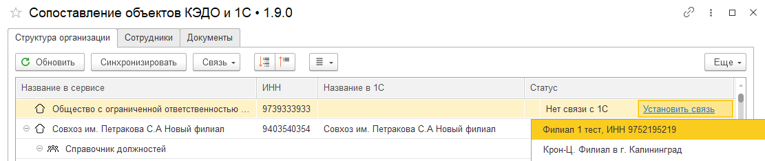 На вкладке «Структура организации» показаны подключенные в КЭДО организации и их подразделения. Нажмите «Установить связь» в строке организации и выберите соответствующую запись из 1С.