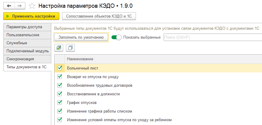 - Нажмите «КЭДО» → «Настройка параметров» → «Типы документов в 1С».