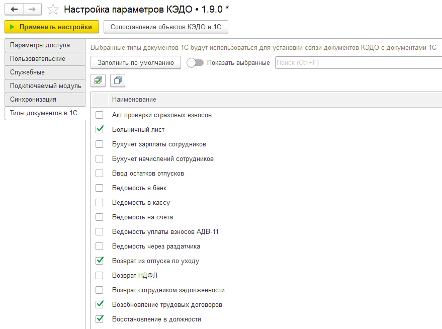 Чтобы настроить список типов документов 1С, доступных для связывания с документами из КЭДО:
