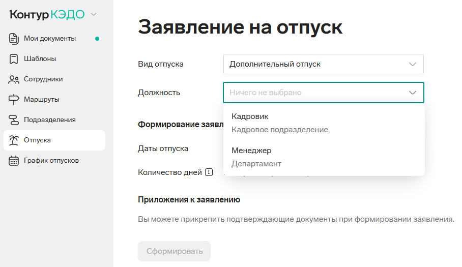 Если сотрудник работает не только по основной должности, но и по внутреннему совместительству, теперь можно выбрать нужную должность при заполнении заявления. Эта должность будет показана в печатной форме заявления.