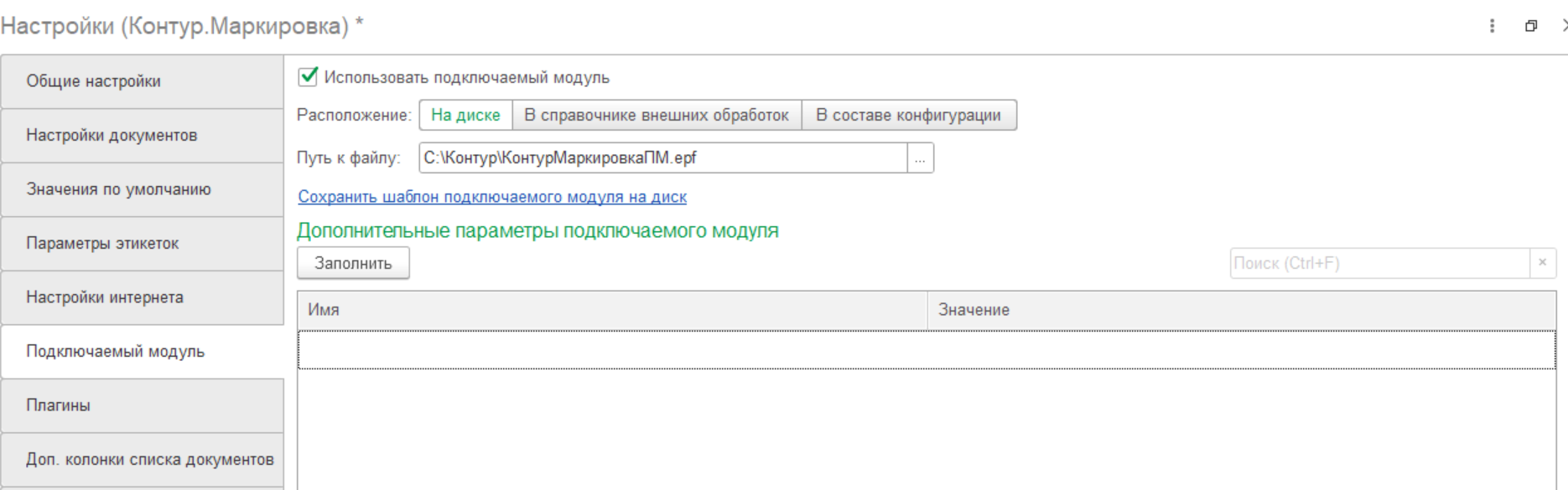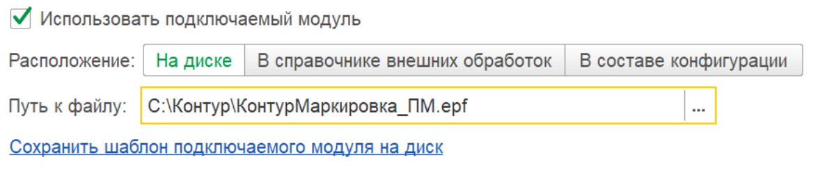 В настройках можно подключить дополнительный модуль для реализации особых возможностей конфигурации. Подключаемый модуль (ПМ) может храниться как отдельный файл в справочнике 1С или же в составе конфигурации.