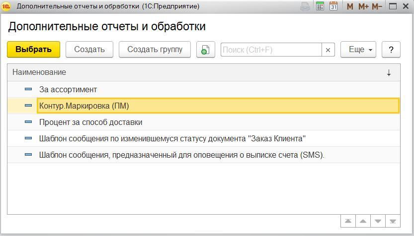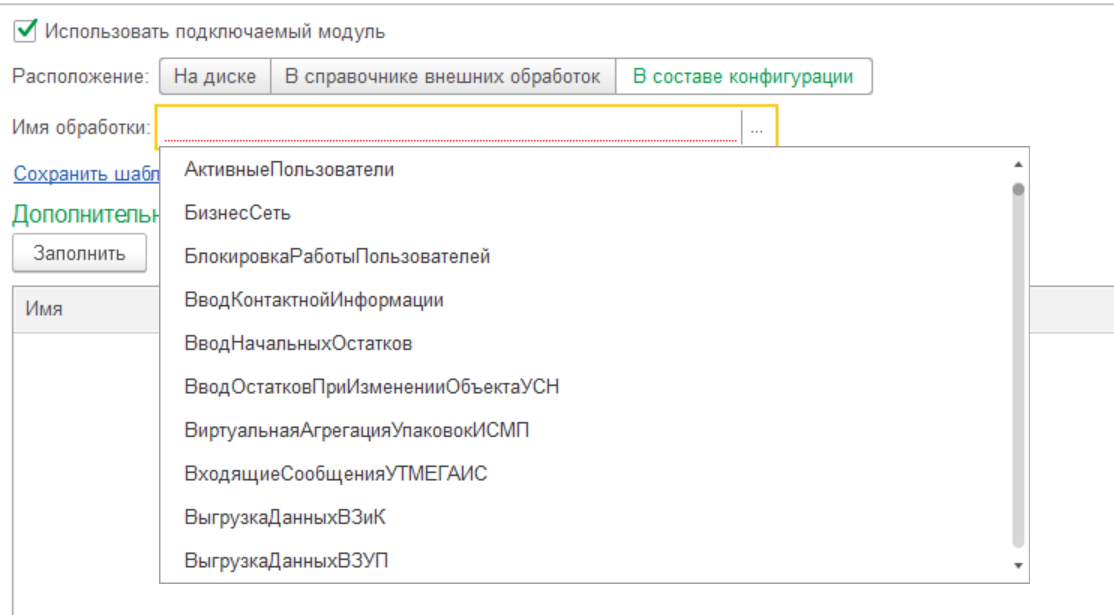 - «В составе конфигурации» — при выборе этого способа ПМ должен быть предварительно добавлен в состав конфигурации. Для подключения ПМ выберите обработку из раскрывающегося списка.
