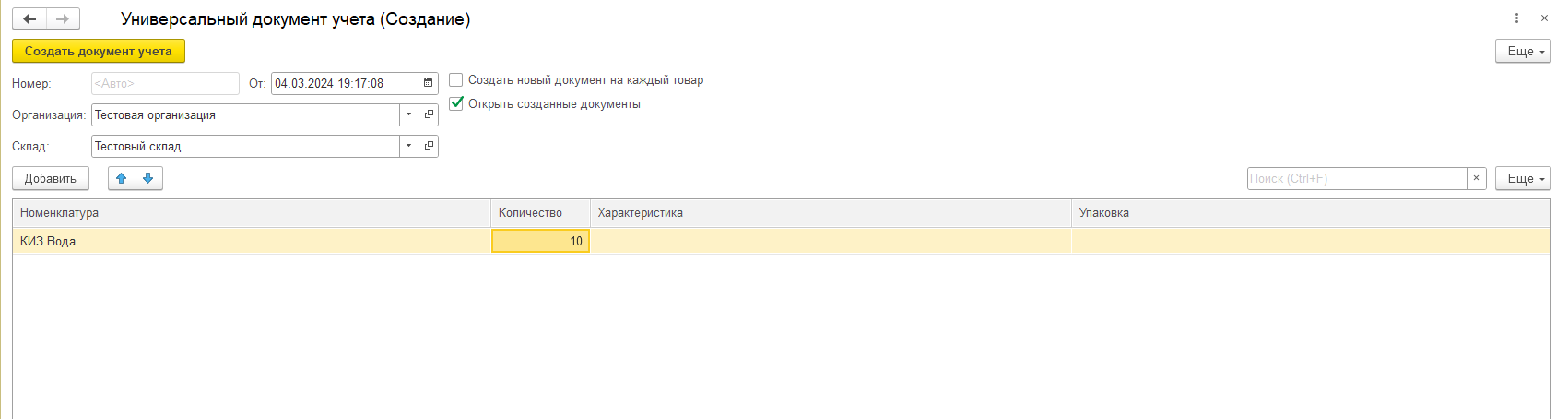 Если проставить галку в чекбоксе «Открыть созданные документы», то после создания документа (или документов) учета будет открыта форма документа учета.