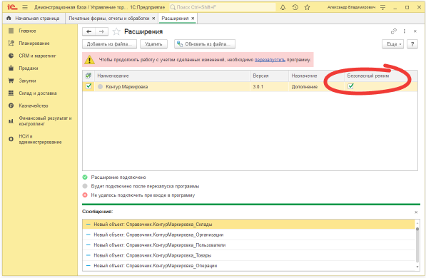 Далее необходимо добавить из файла расширение Контур.Маркировки, например, «KonturMark_3_0_1.cfe». Для этого нажмите кнопку «Добавить из файла...» и выберите нужный файл.