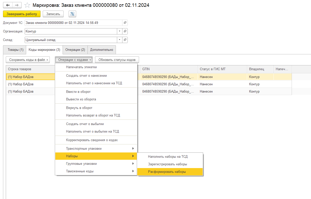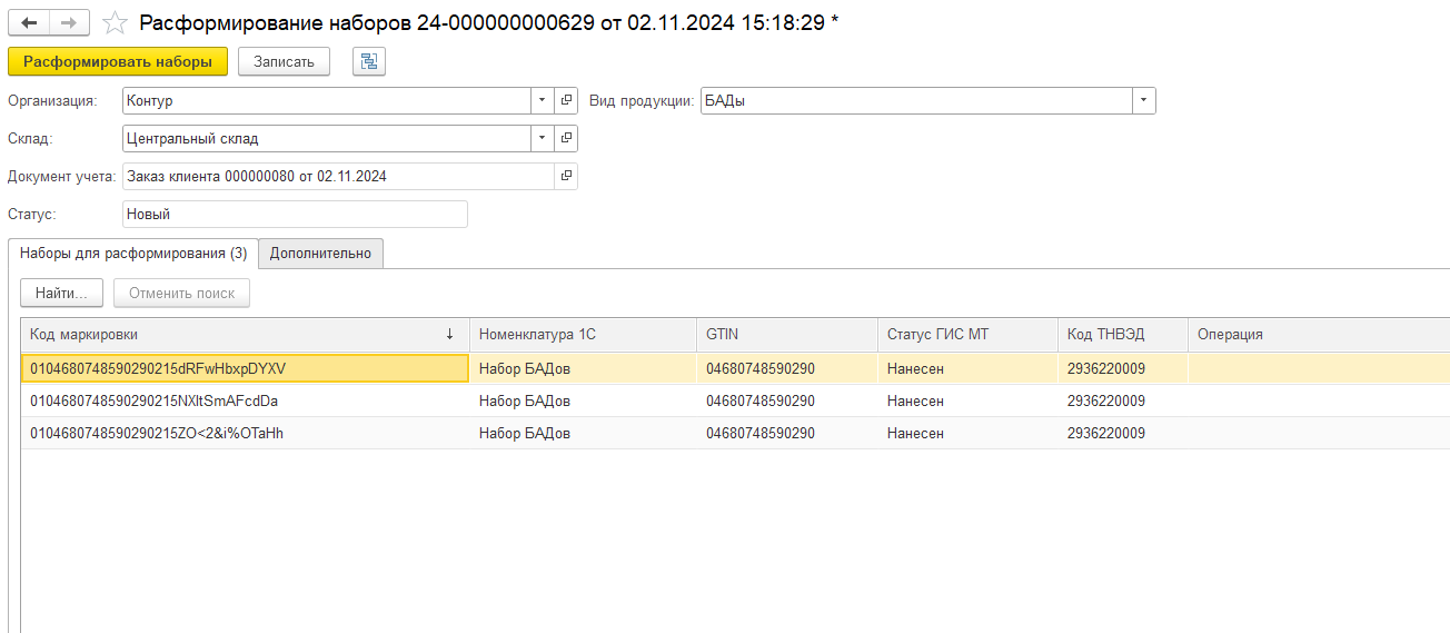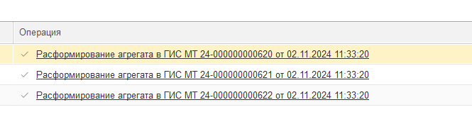 После расформирования в ГИС МТ коды наборов получают статус «Списан». Для расформирования наборов: Нажмите на кнопку «Операции с кодами» → «Наборы» → «Расформировать наборы». Нажмите на кнопку «Расформировать наборы». Операцию по каждому расформированному товару можно посмотреть нажав на строку «Расформирование агрегата в ГИС МТ» в колонке «Операция».