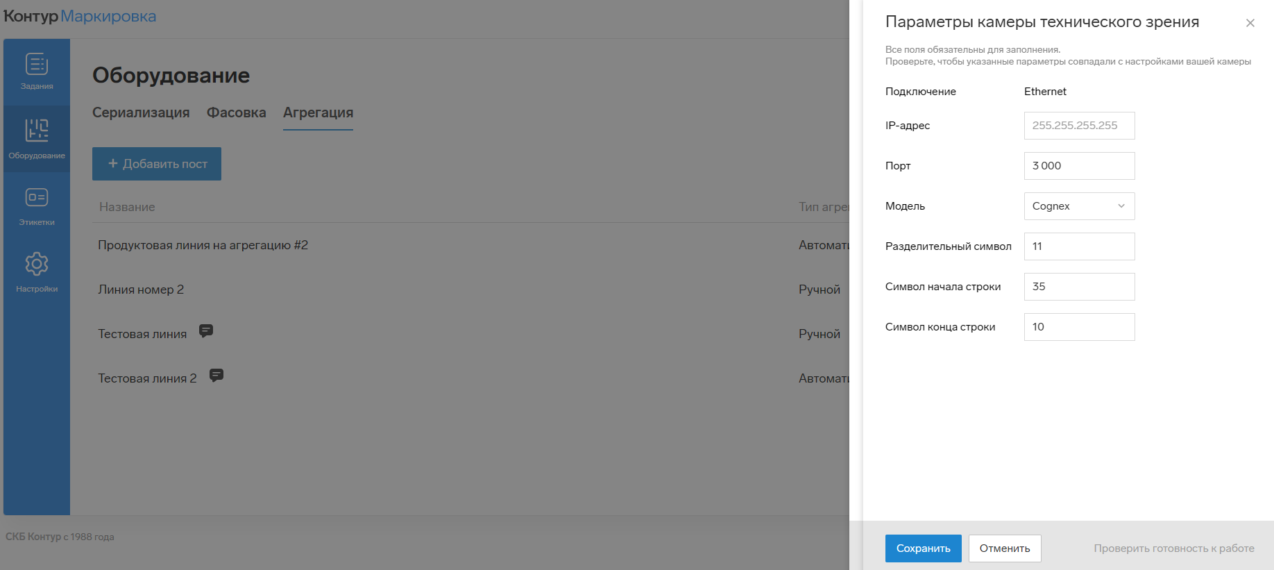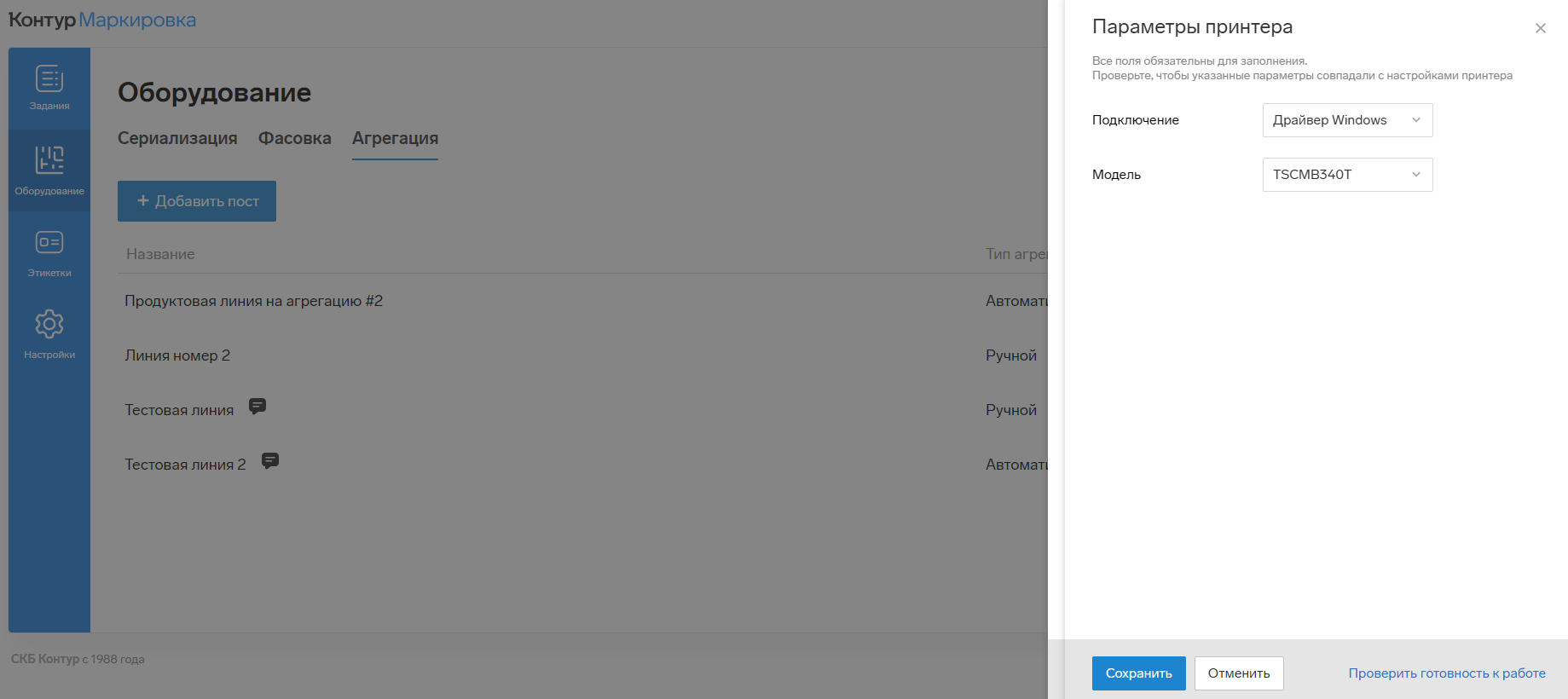 - Установите параметры выбранного оборудования. Вы можете проверить готовность оборудования к работе, для этого нажмите на «Проверить готовность к работе».
