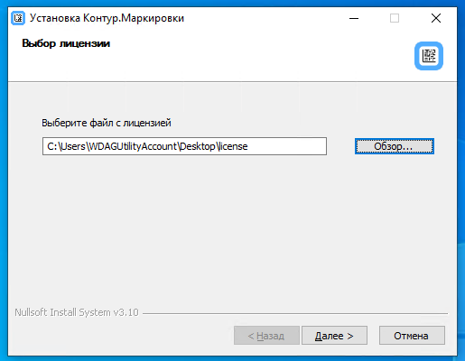 - В окне выбора лицензии укажите путь к файлу лицензии, который был получен вместе с установщиком.