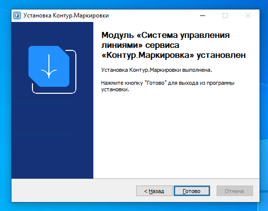 - Когда установка завершится, то появится окно «Модуль «Система управления линиями сервиса «Контур.Маркировка» установлен». Для завершения установки нажмите кнопку «Готово».