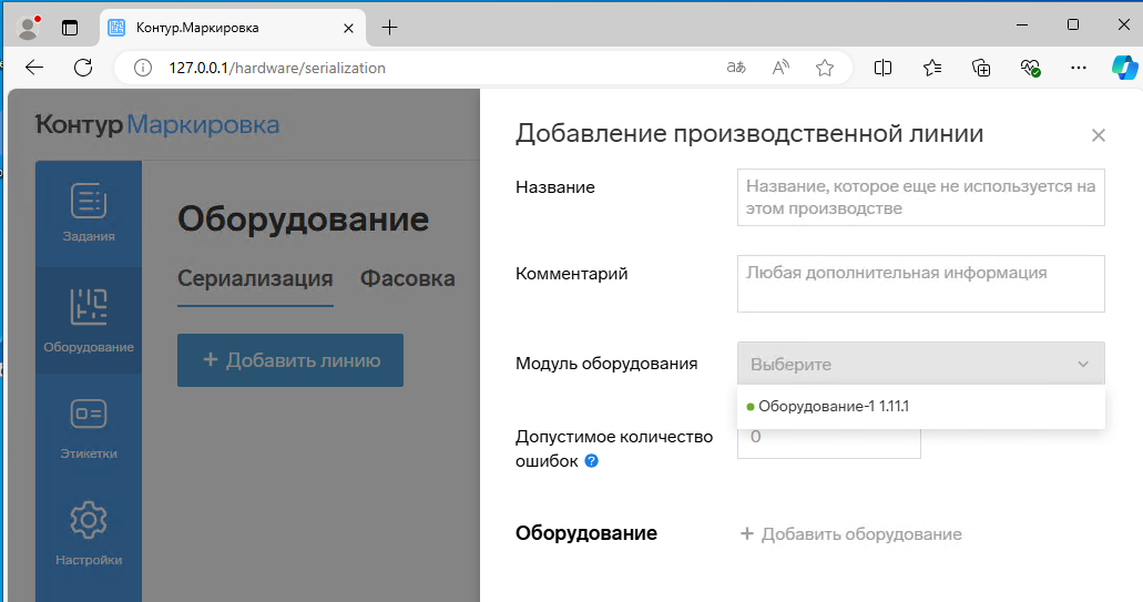 - Обязательно проверьте, что «Модуль оборудования» выбирается и статус у него «Работает» (указан зеленый круг рядом с названием оборудования).