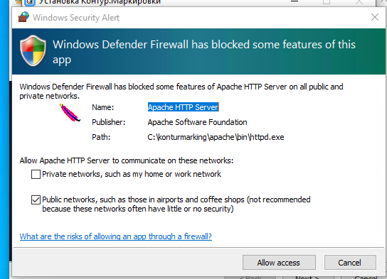 Обязательно нажмите «Allow access» или «Разрешить доступ». После начнется установка программы Apache. - Параллельно откроется окно установки программы «Система Управления Базами Данных — PostgreSQL».