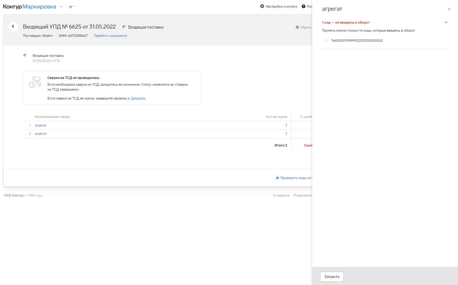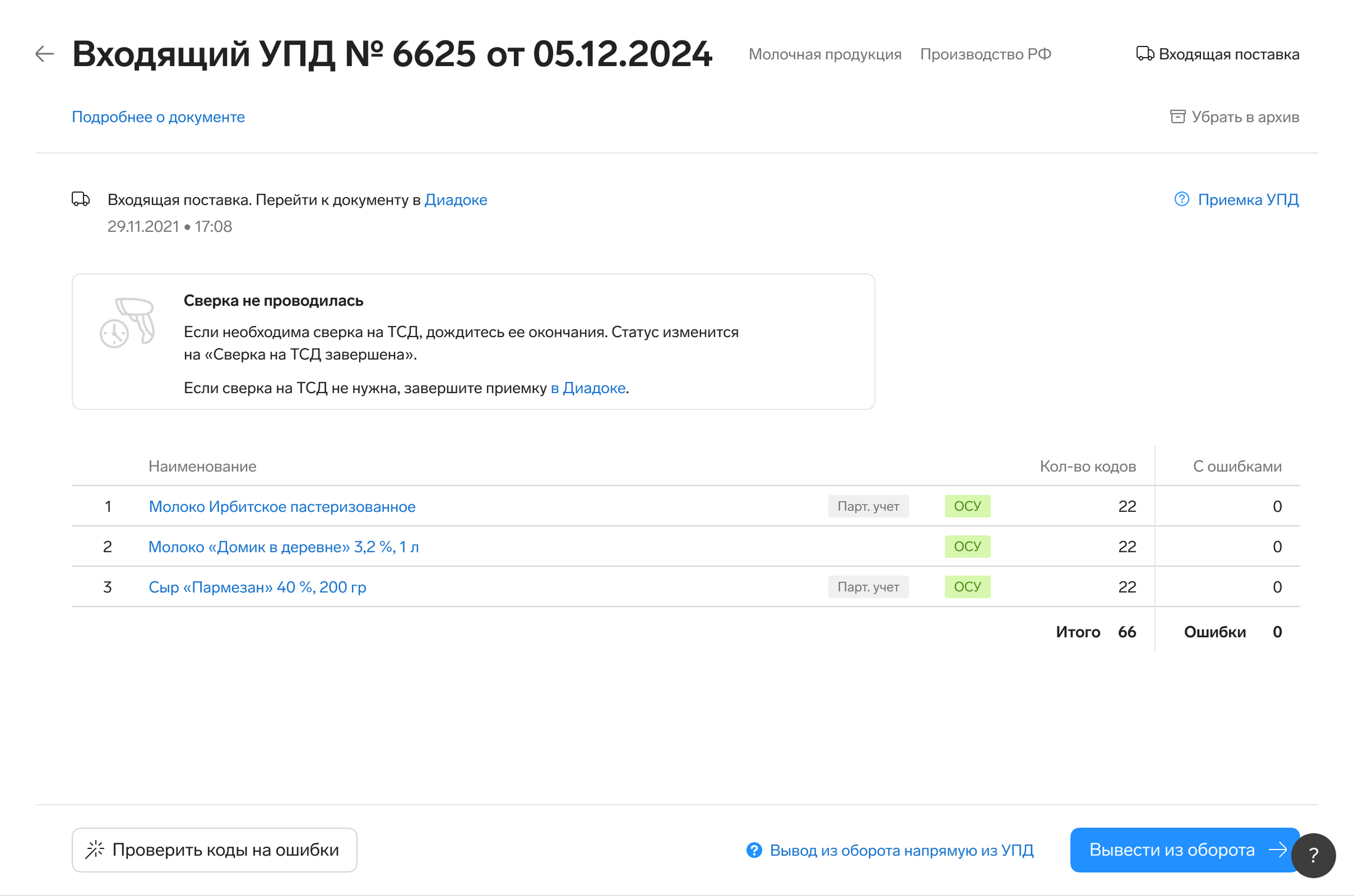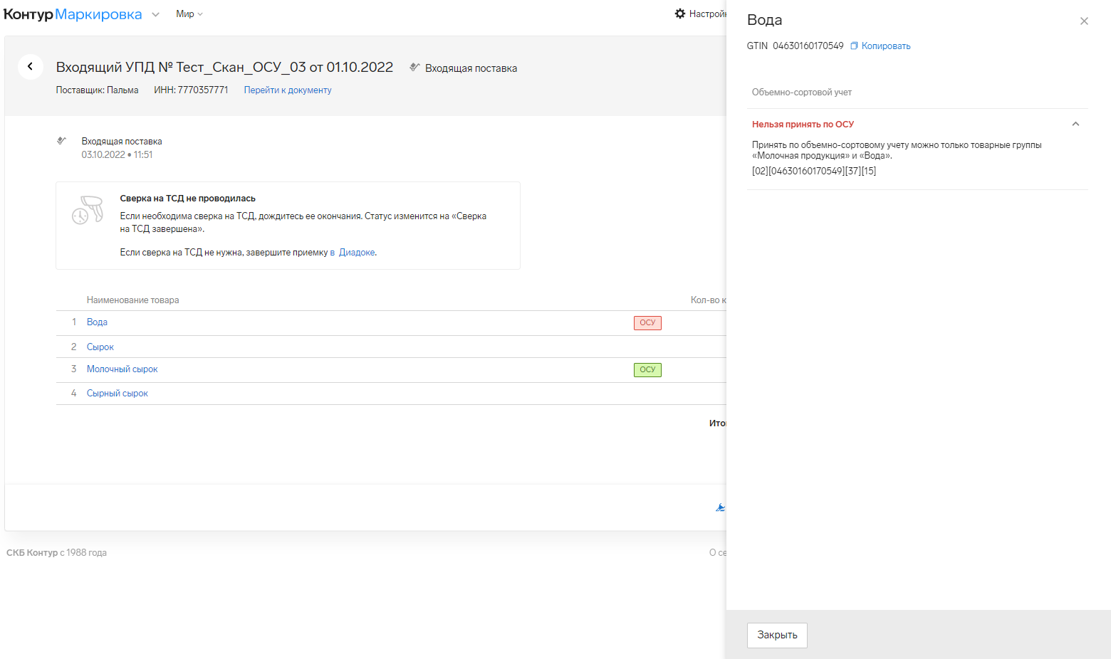 Если агрегат не зарегистрирован, то он будет отображаться в разделе «не введены в оборот». - Если во входящем УПД есть позиции с объемно-сортовым учетом, то отобразится соответствующий значок напротив наименования товара.