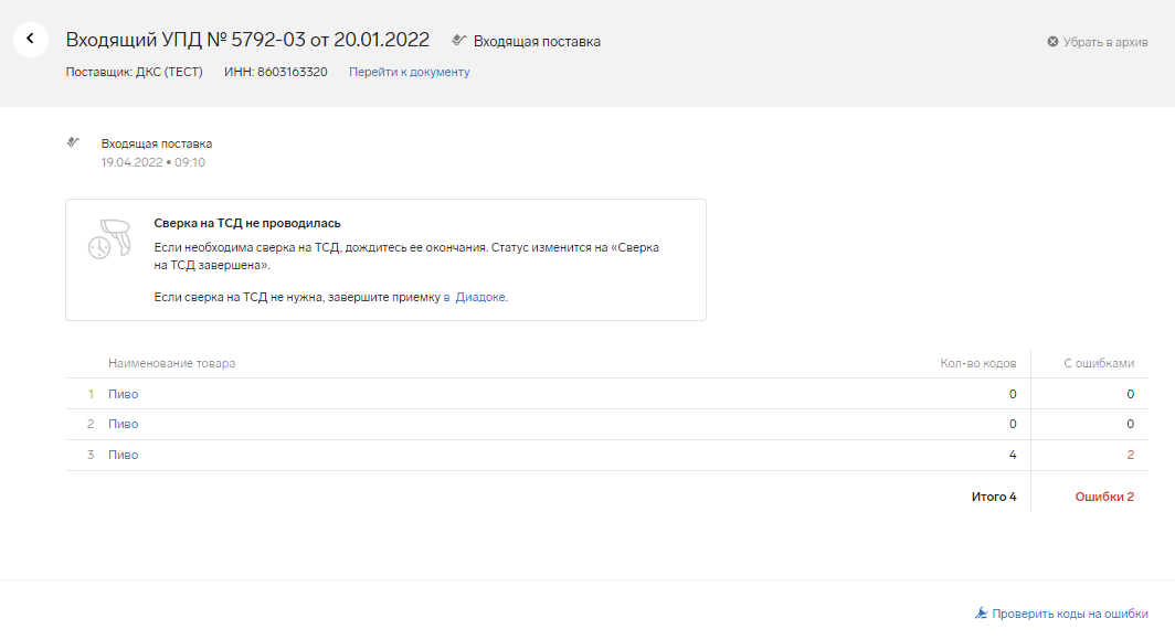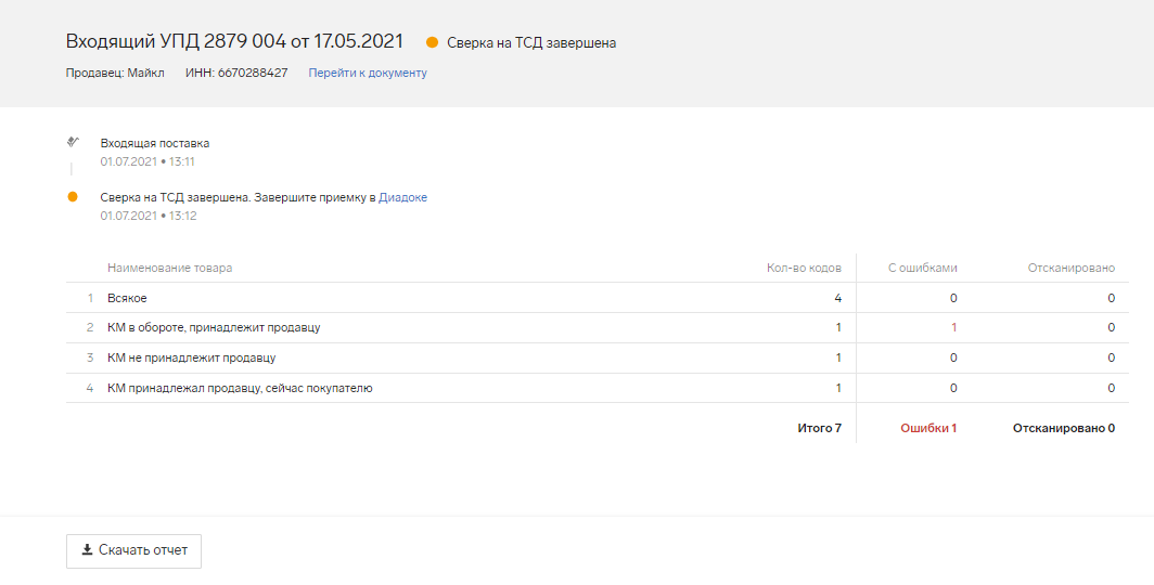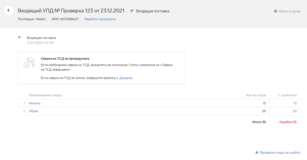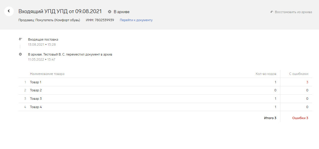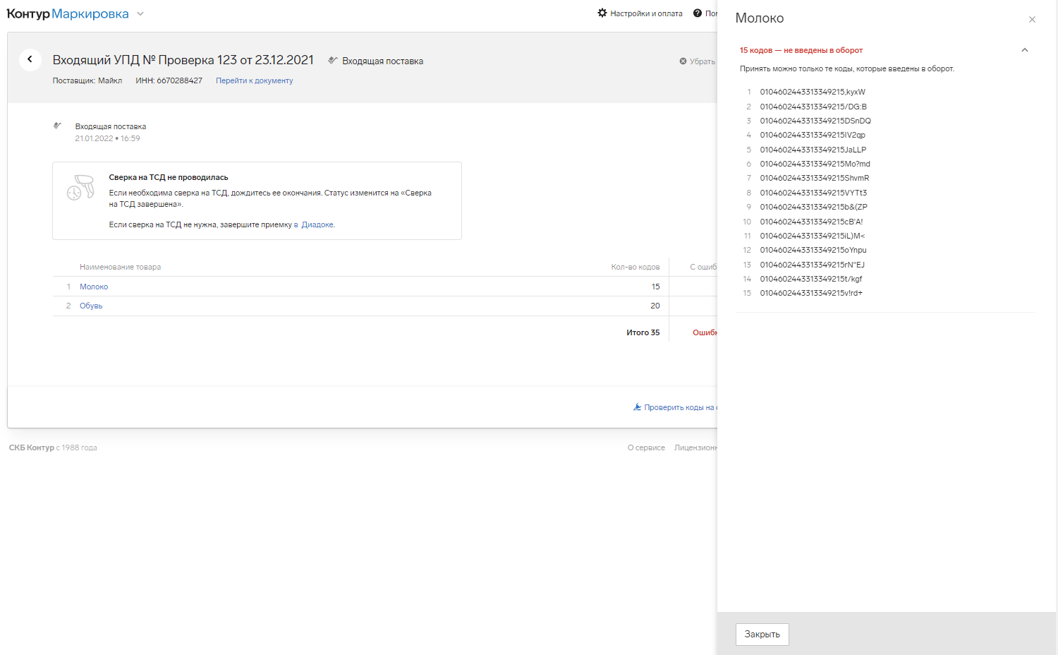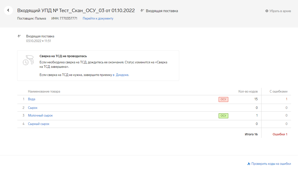 Если агрегат не зарегистрирован, то он будет отображаться в разделе «не введены в оборот». - Если во входящем УПД есть позиции с объемно-сортовым учетом, то отобразится соответствующий значок напротив наименования товара.