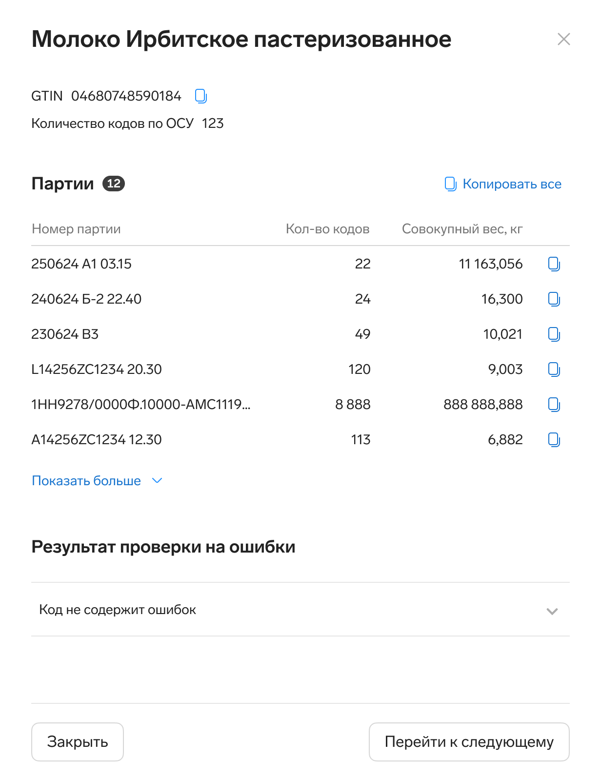 Чтобы просмотреть данные о партиях, а также скопировать их номера, нажмите на строку с наименованием. Графа «Совокупный вес» отобразится, если он указан для данной партии.