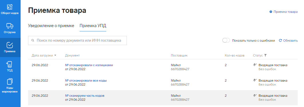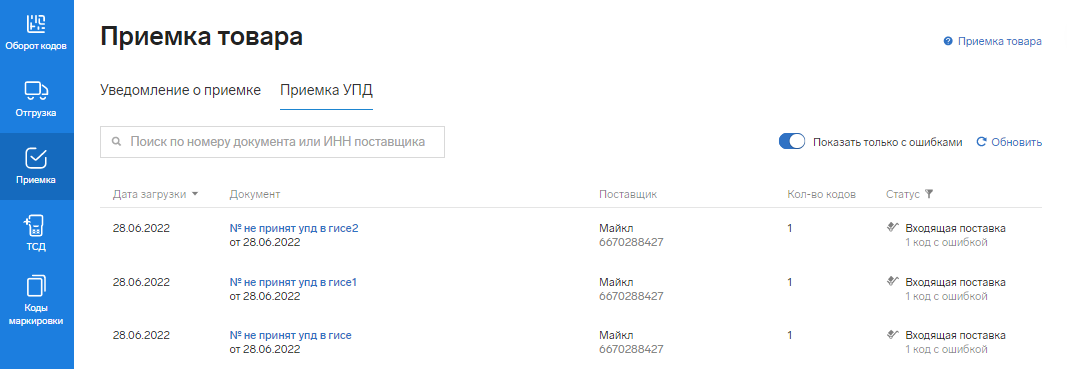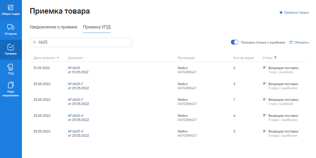 - Чтобы на странице отобразились только документы с ошибками, передвиньте ползунок в строке «Показать только с ошибками». Отобразятся документы, которые содержат коды с ошибками.