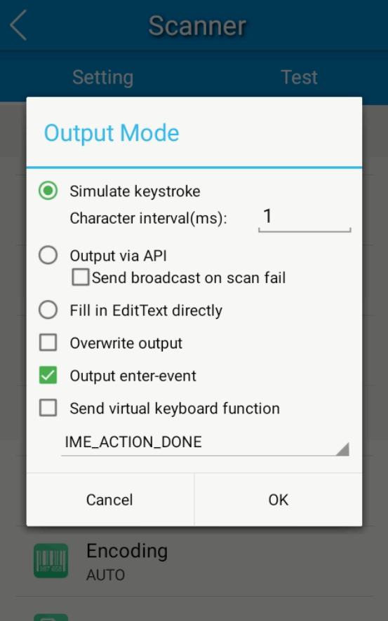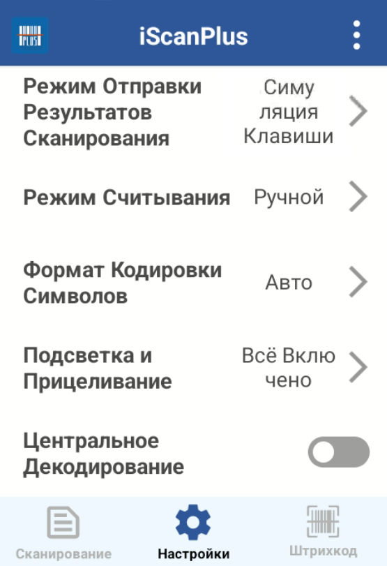 - Далее, в приложении, установите «Симуляция Клавиши» в пункте «Режим Отправки Результатов Сканирования».