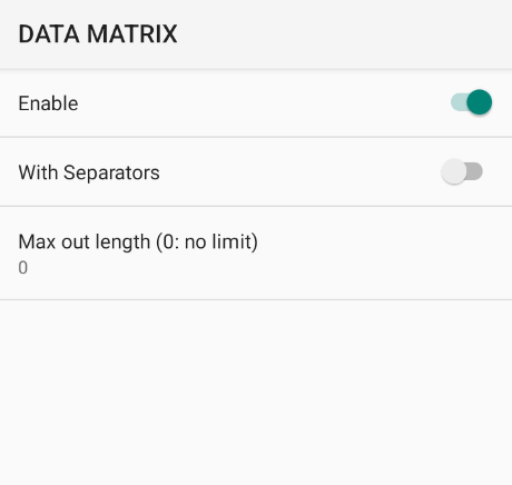 Далее откройте Barcode settings, выберите DATA MATRIX, а затем включите считывание. Для этого передвиньте ползунок «Enable» вправо.