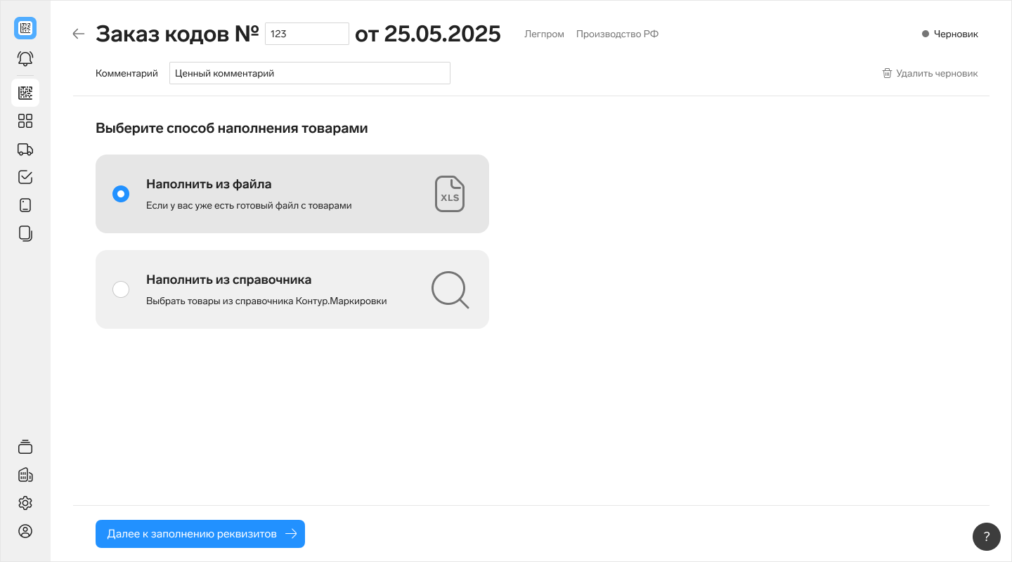 Нажмите на кнопку «Заказать коды». Выберите товарную группу. Выберите способ наполнения товарами «Наполнить из файла». Далее нажмите на кнопку «Далее к заполнению кодов».