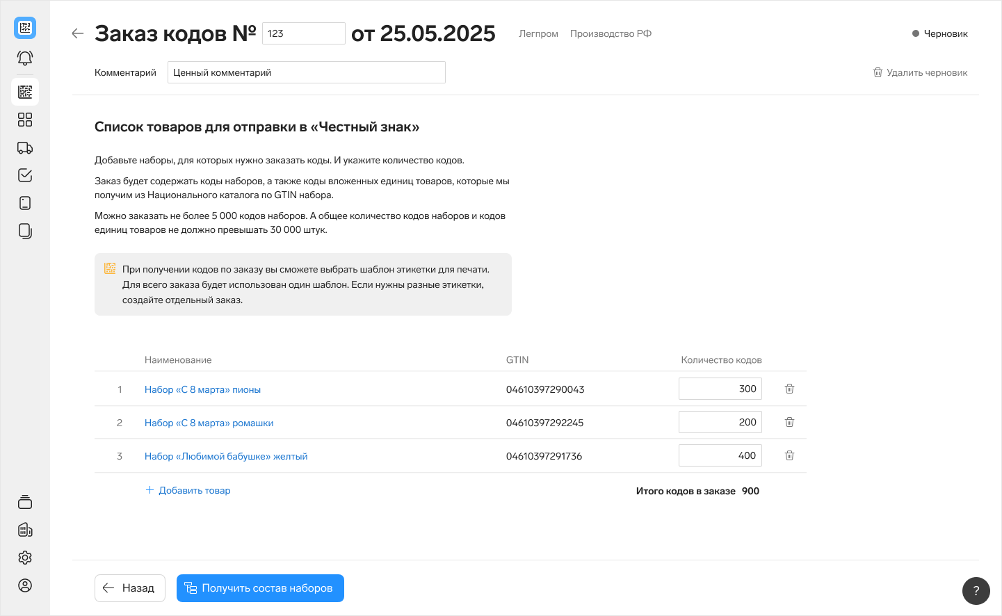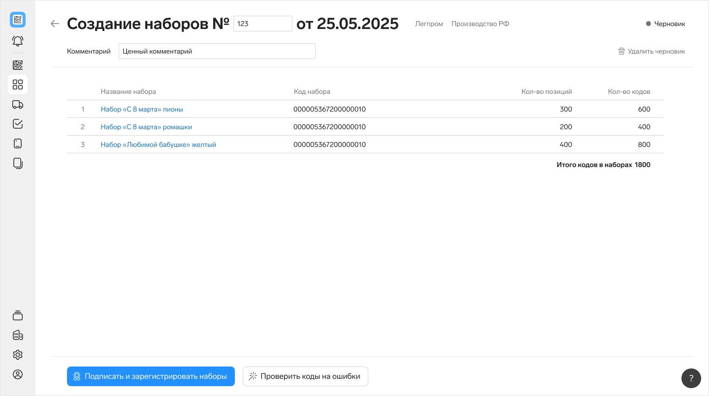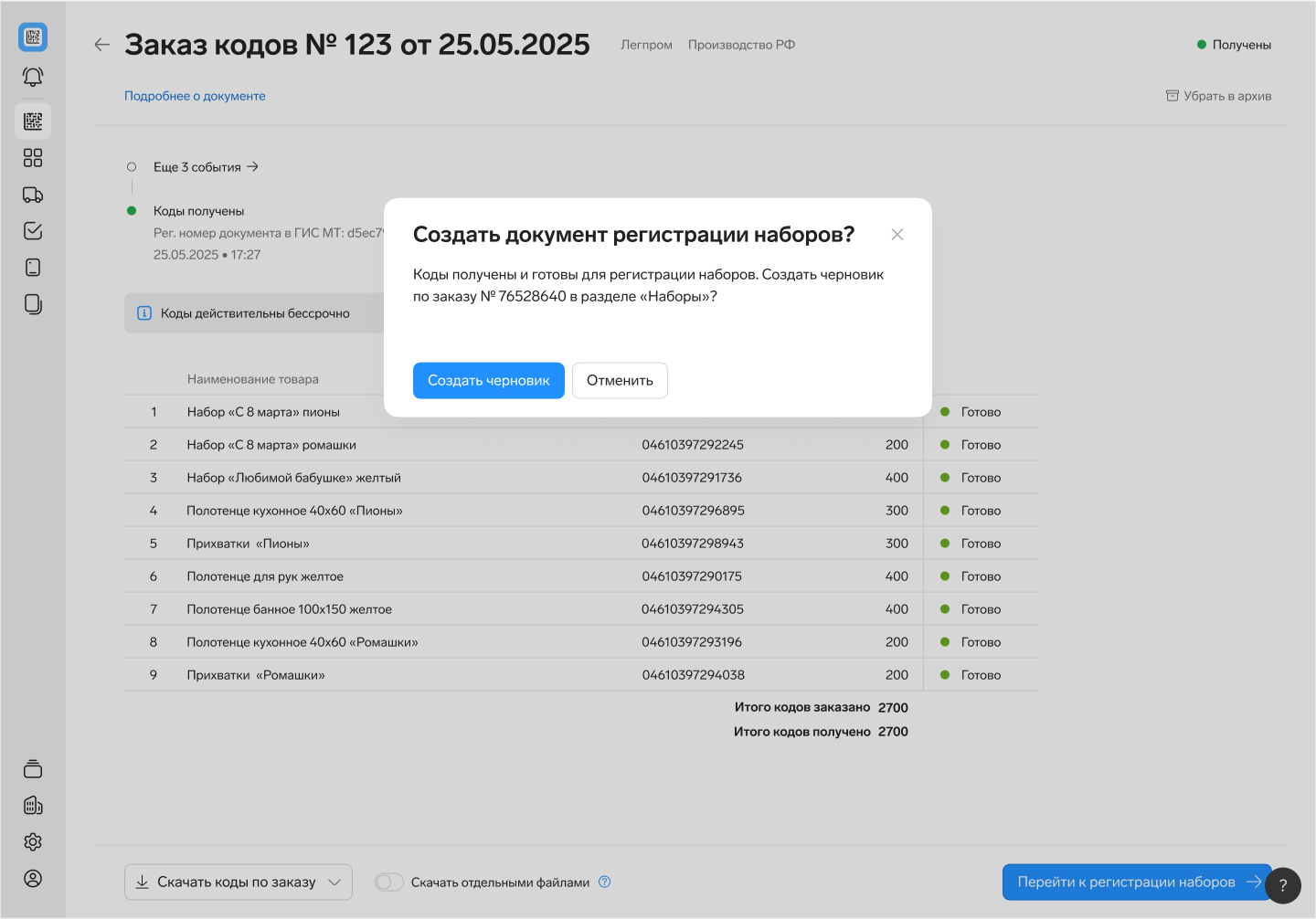 Если коды получены частично, то можно взять полученные коды и зарегистрировать их обычным способом через раздел «Создание наборов». Кнопки перехода к сквозному сценарию на данной странице не будет.