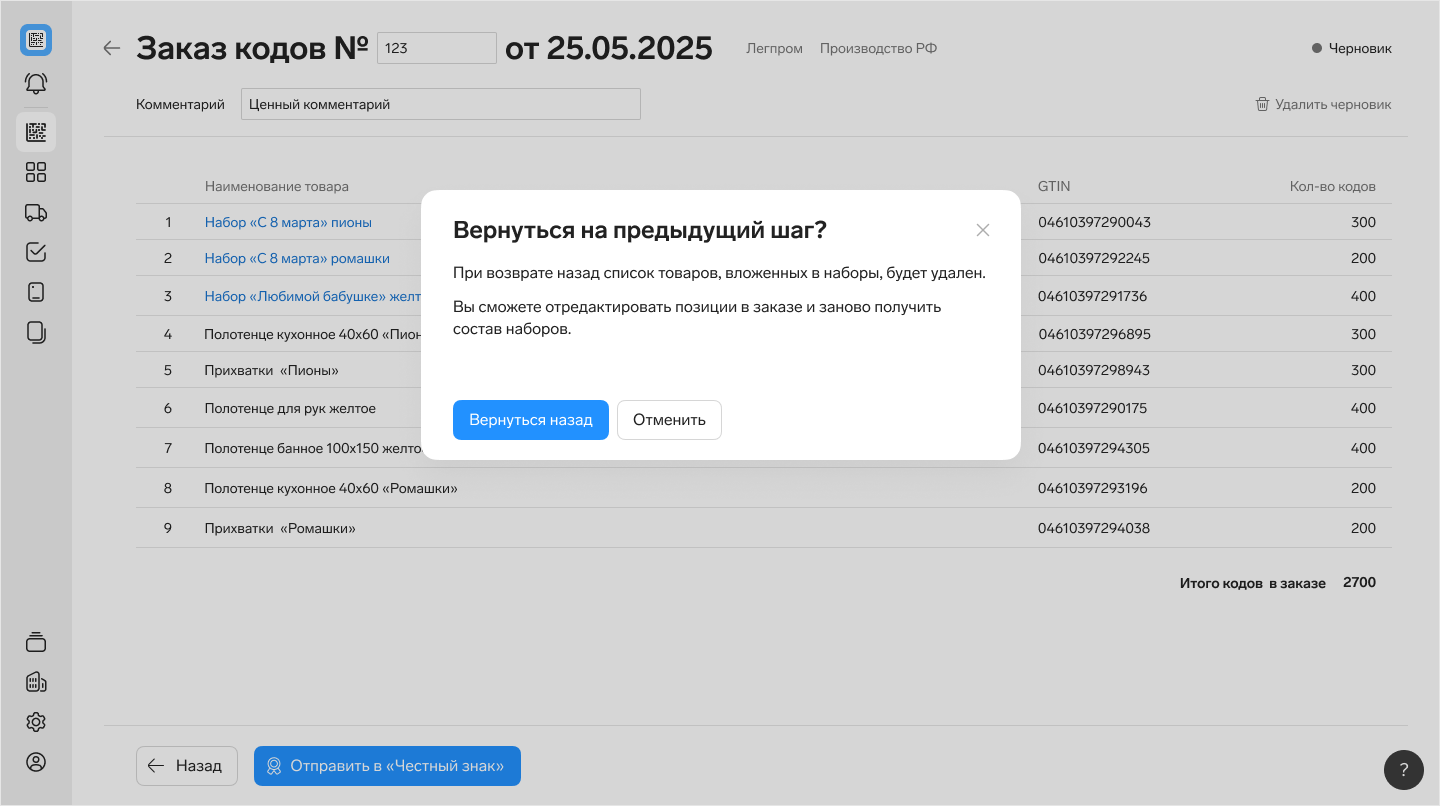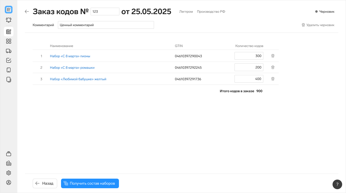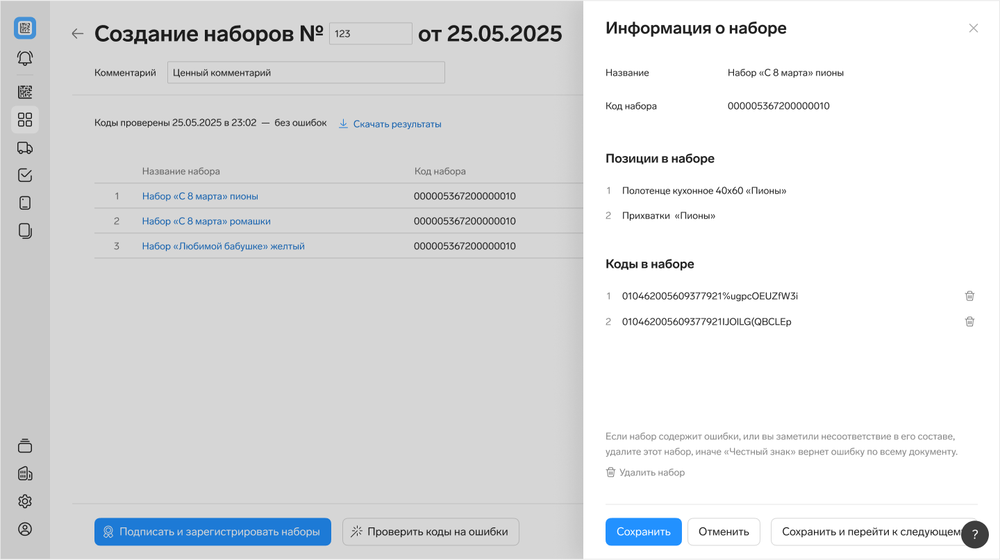 Если коды получены частично, то можно взять полученные коды и зарегистрировать их обычным способом через раздел «Создание наборов». Кнопки перехода к сквозному сценарию на данной странице не будет.