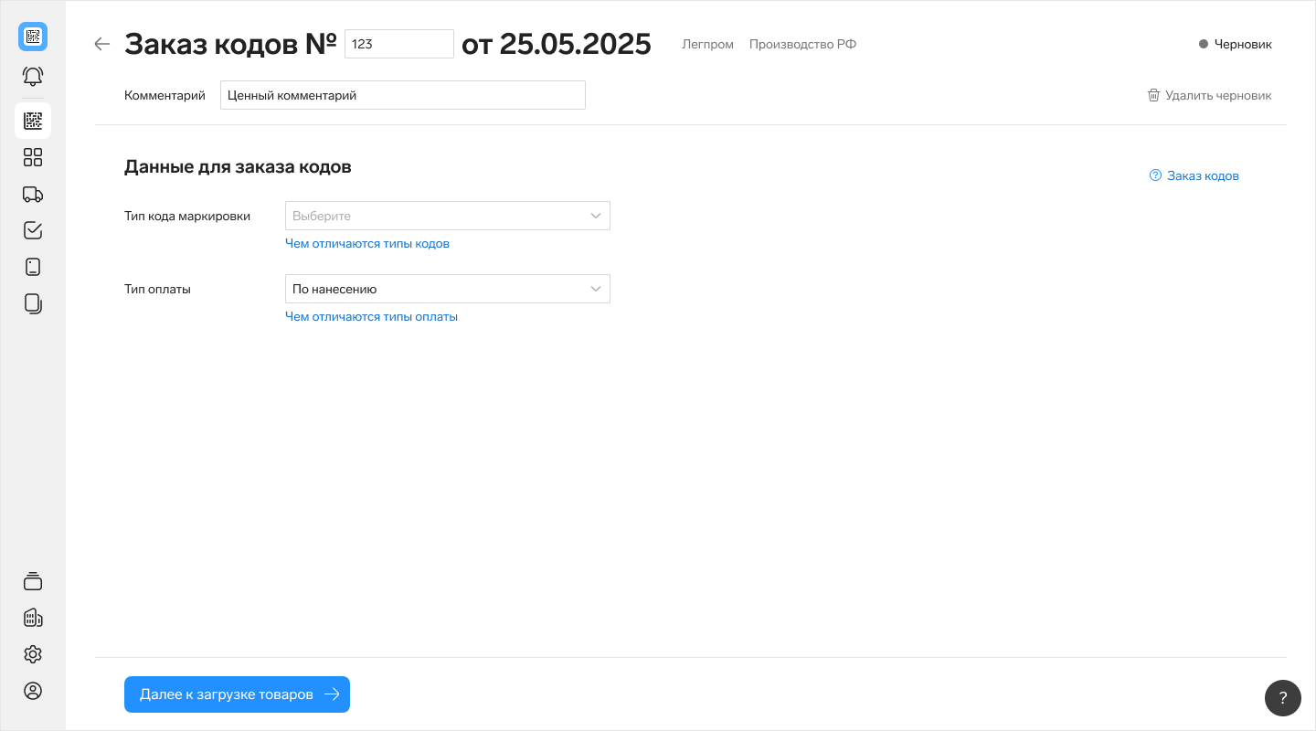 Выберите тип оплаты. Нажмите на кнопку «Далее к загрузке товаров».