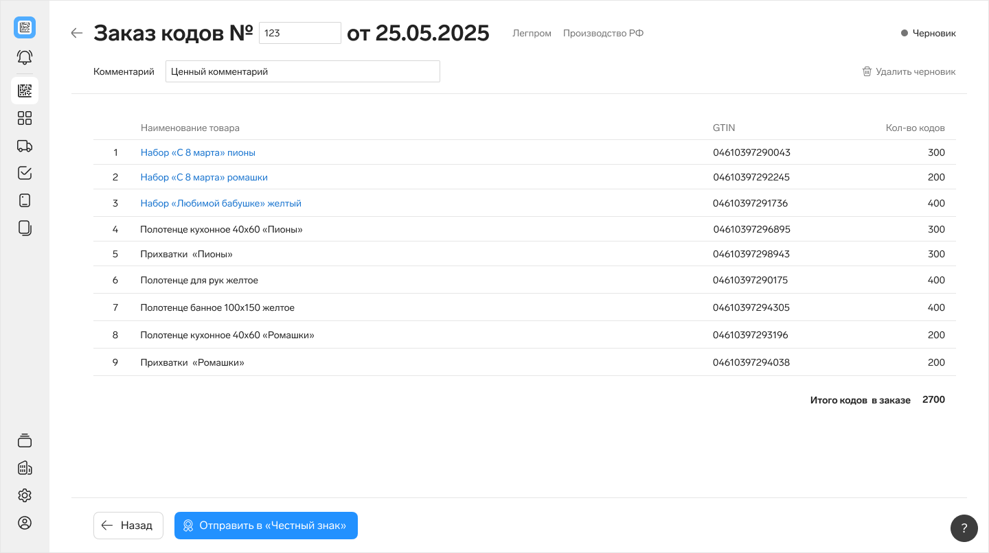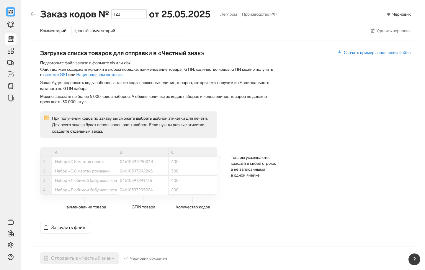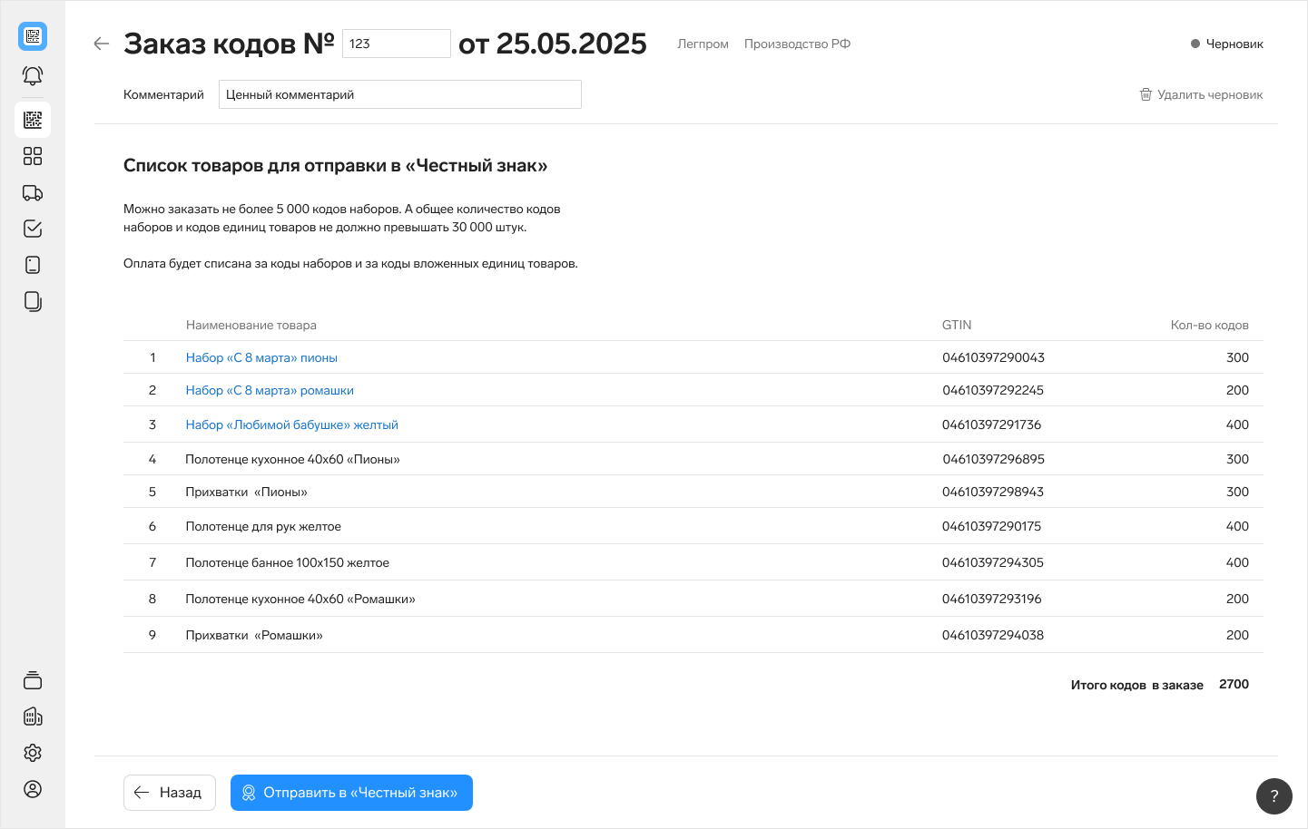 Нажмите на кнопку «Отправить в «Честный знак». Далее сценарий аналогичен сценарию наполнения через файл.