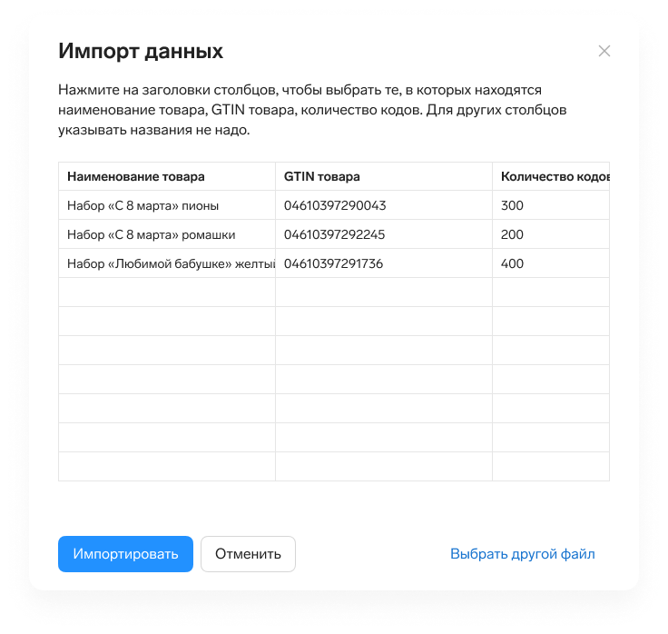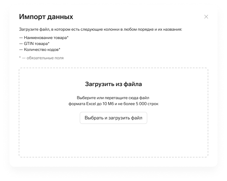 Откроется окно импорта кодов. Выберите или перетащите файл в данное окно.