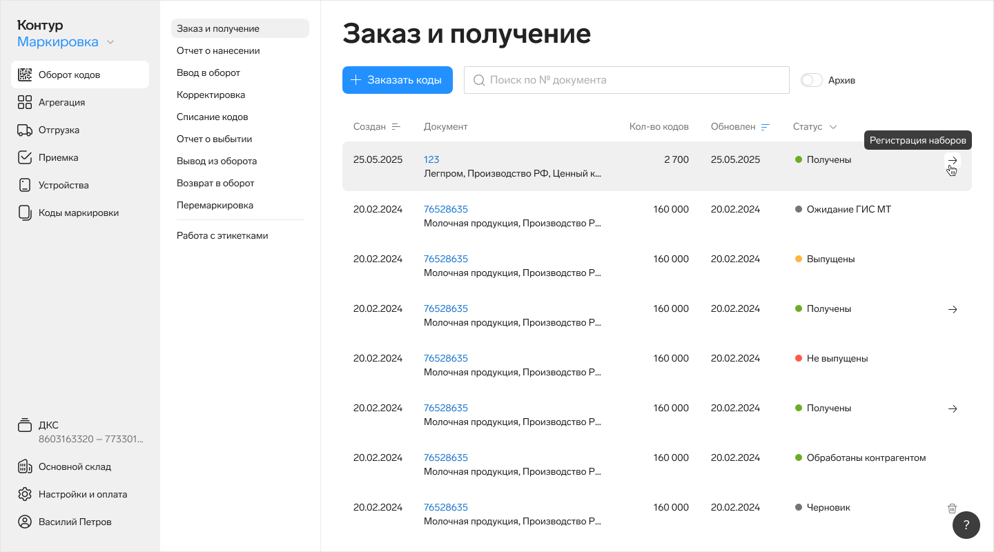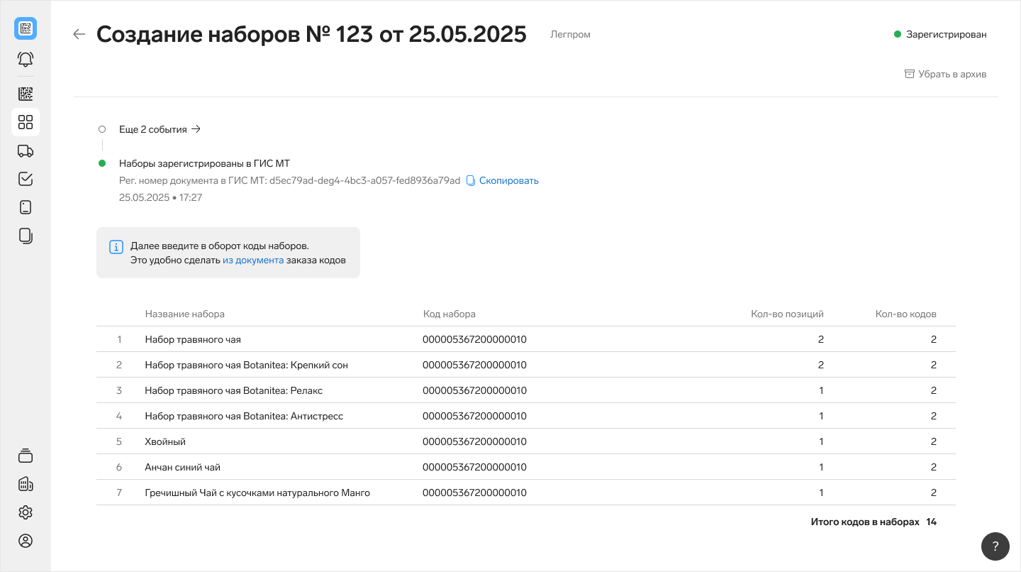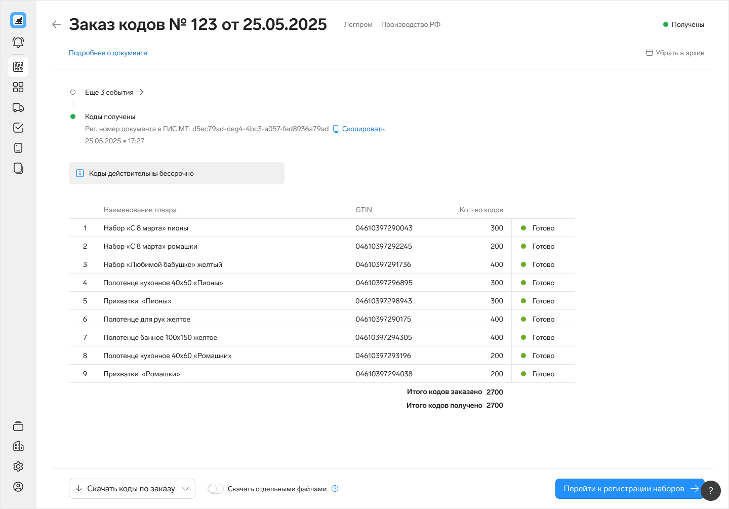 После успешной регистрации наборов откроется страница с предложением перейти в документ заказа для ввода кодов в оборот.