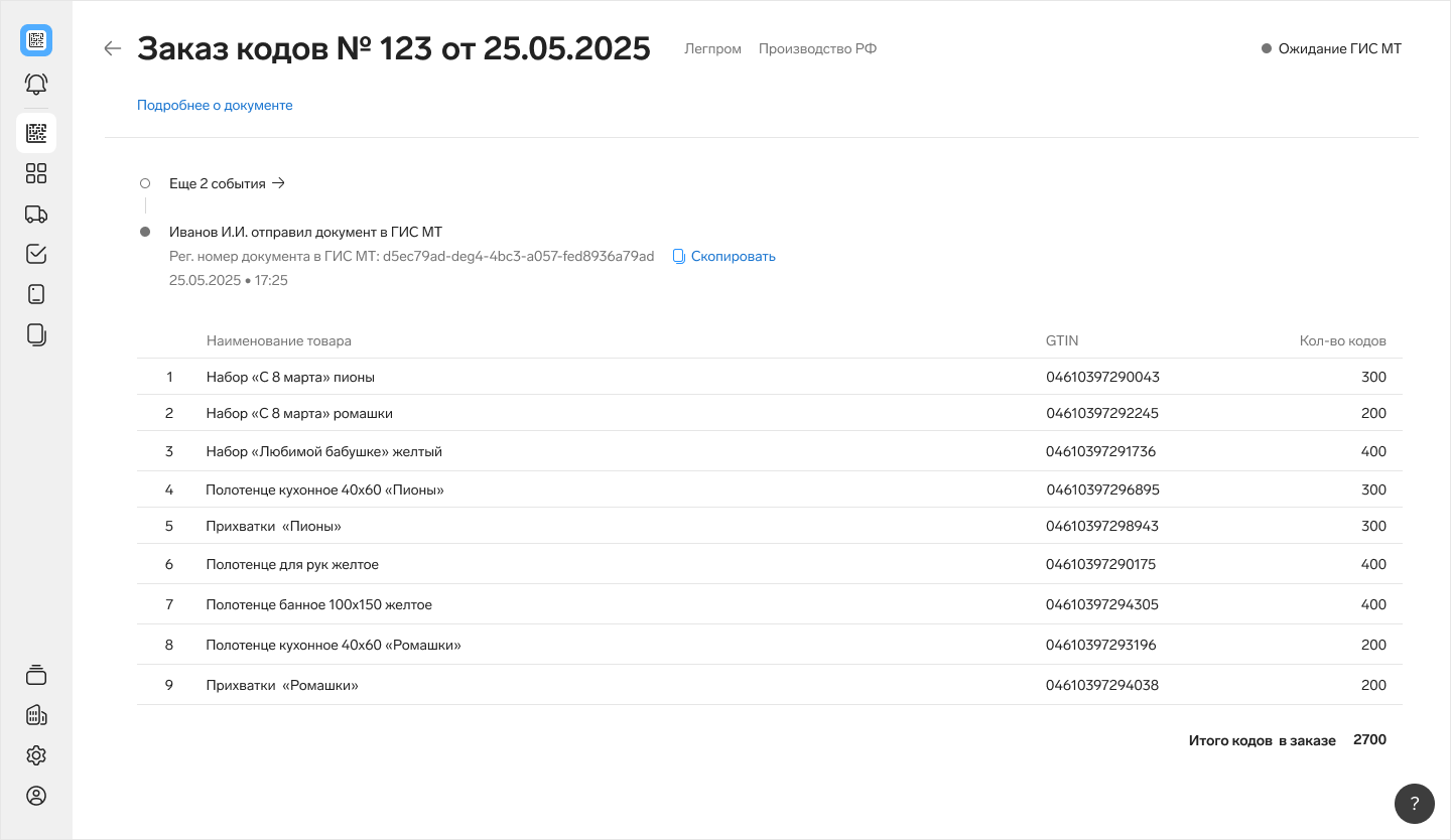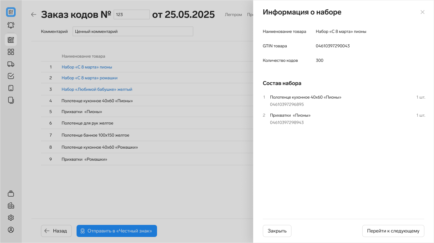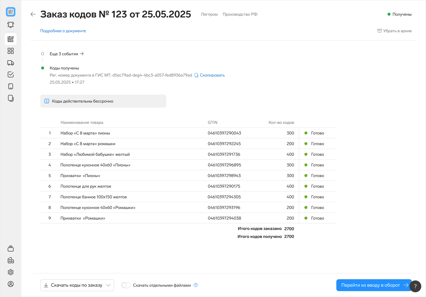 После успешной регистрации наборов откроется страница с предложением перейти в документ заказа для ввода кодов в оборот.