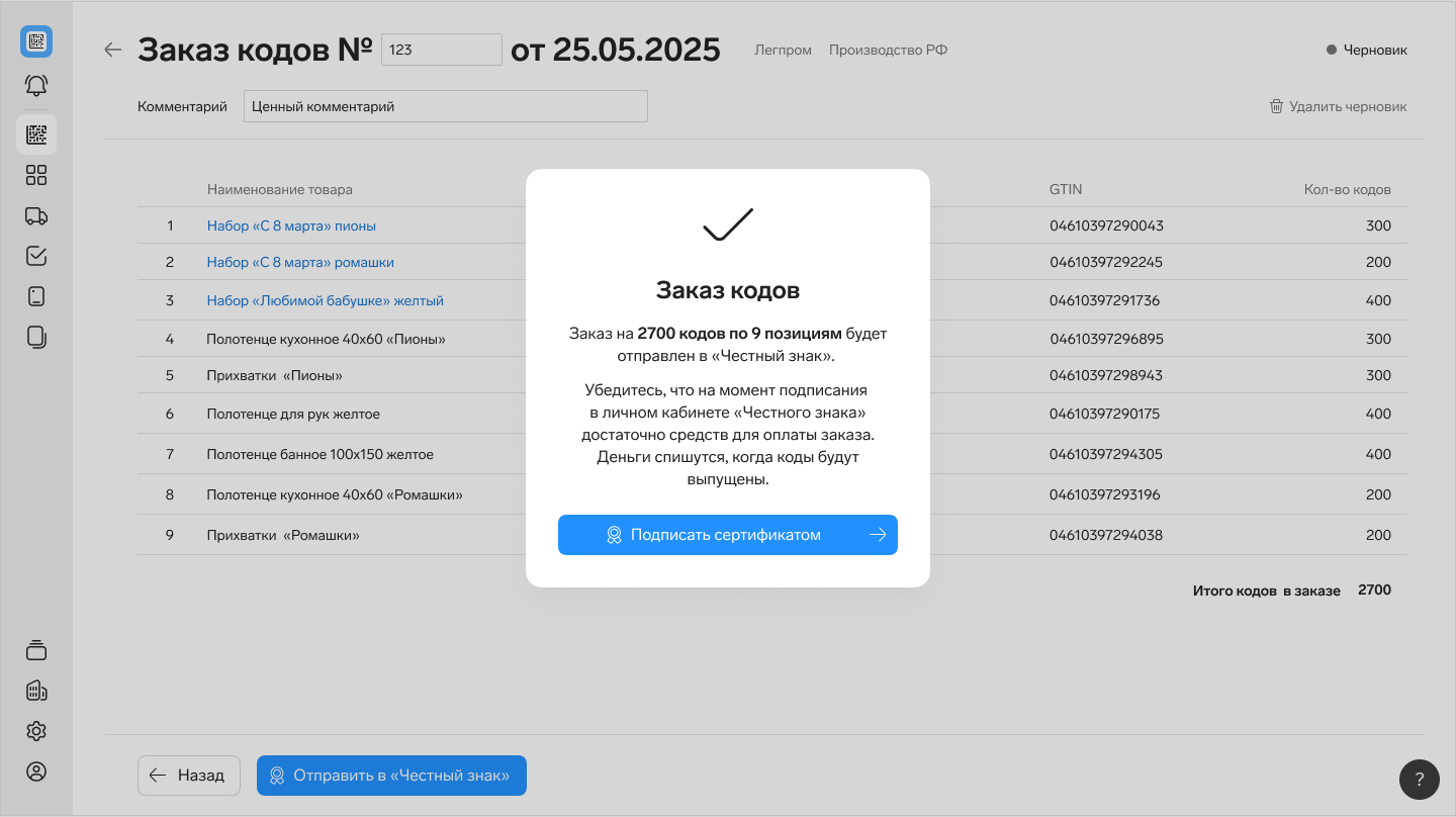 После нажатия кнопки «Отправить в Честный знак» появится окно с предупреждением о списании денег. Нажмите на кнопку «Подписать сертификатом».