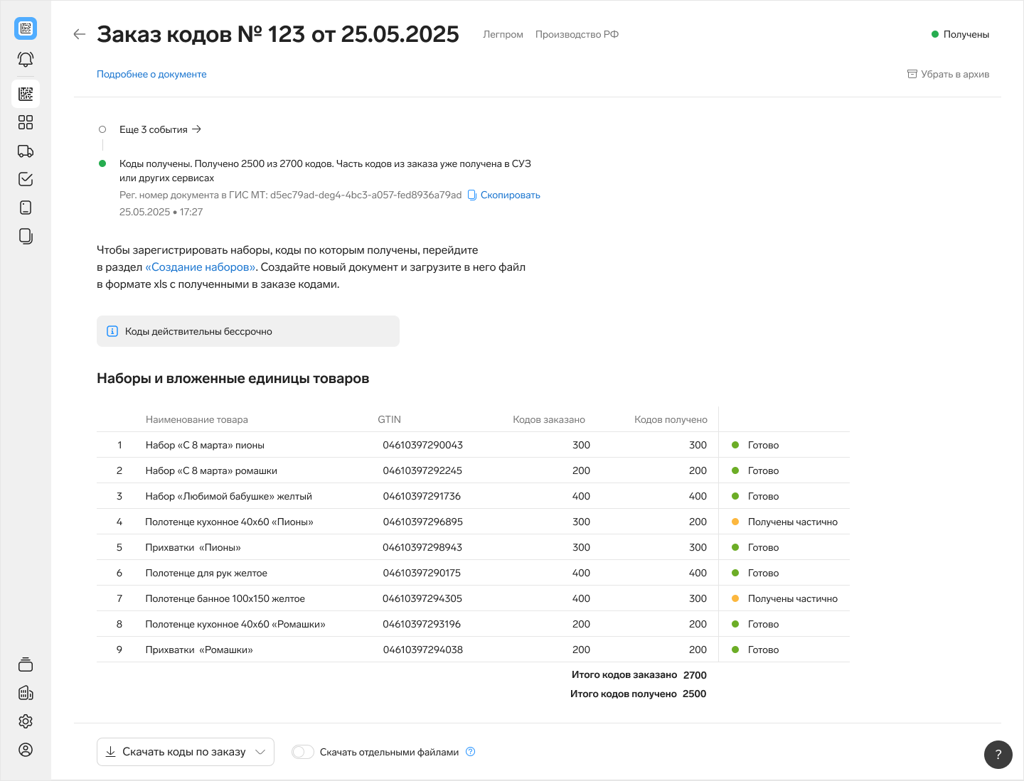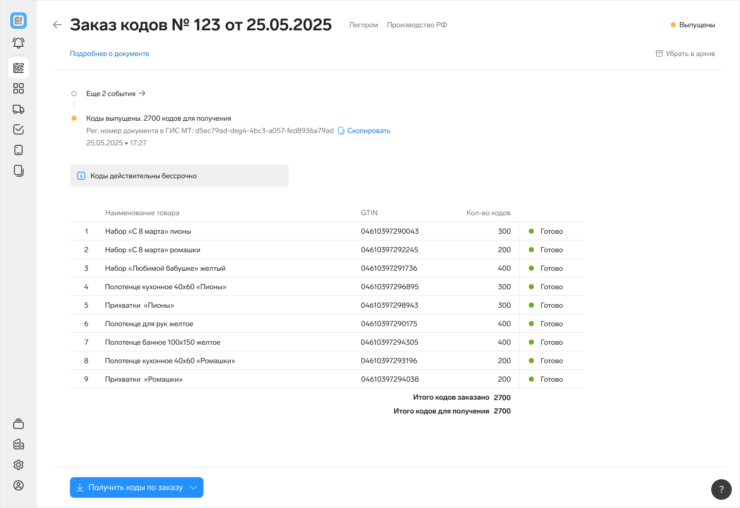 Когда коды будут выпущены, их можно получить. Нажмите на кнопку «Получить коды по заказу».
