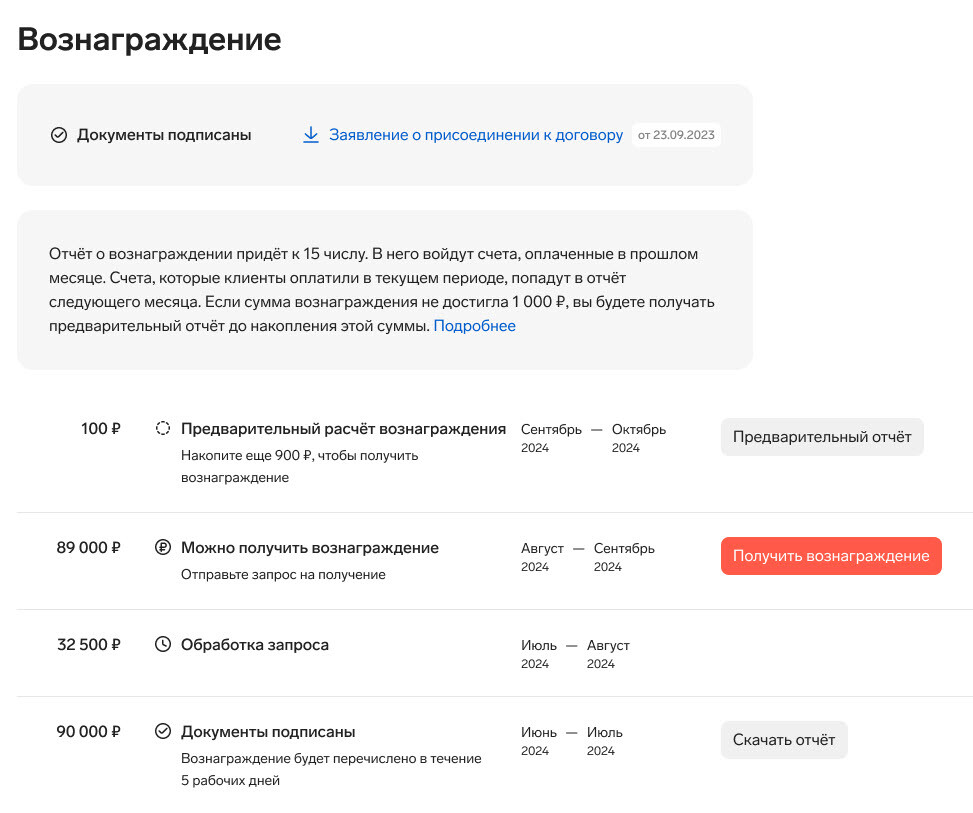 Вознаграждение поступает в виде отчета на вкладку «Вознаграждение» к 15 числу месяца за предыдущий период.