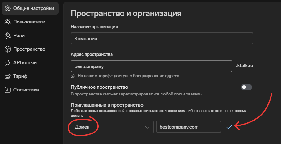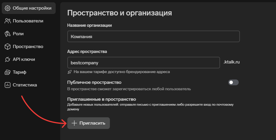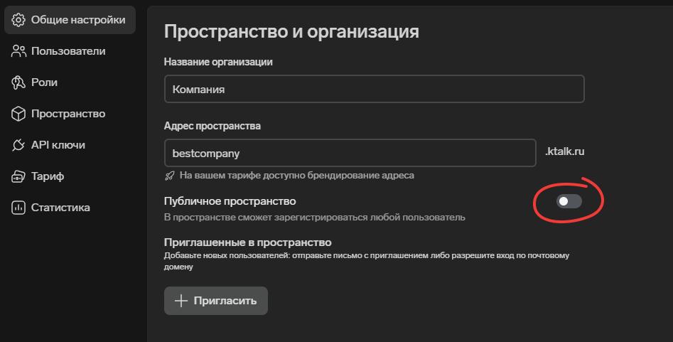 - На вкладке «Общие настройки» проверьте, что настройка «Публичное пространство» выключена.