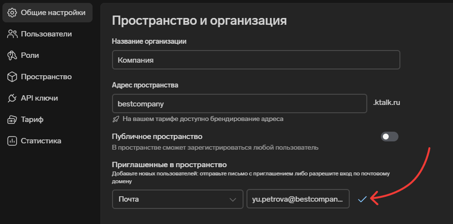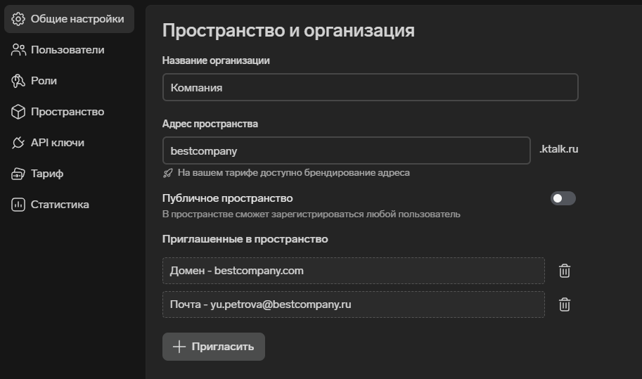 Добавлять новых пользователей в пространство может только администратор. В каждом пространстве Толка можно зарегистрировать неограниченное количество пользователей.