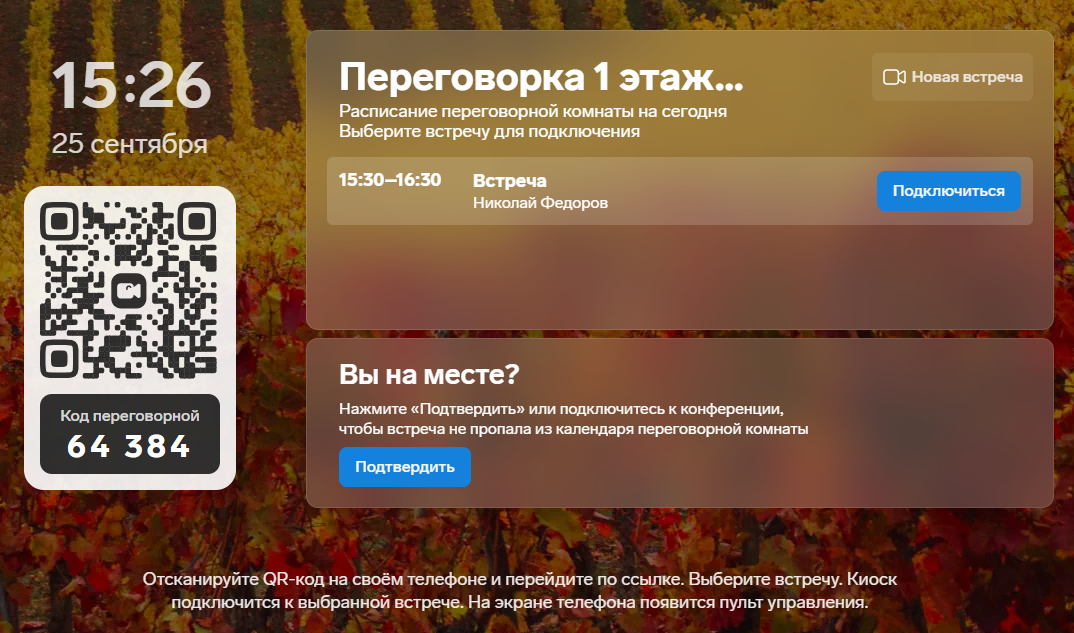 Если на киоске включено подтверждение занятости, нажмите «Подтвердить» или подключитесь к встрече.