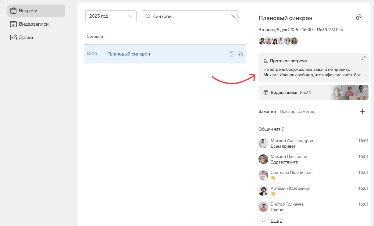 - Если велась запись встречи, то она отобразится здесь же.