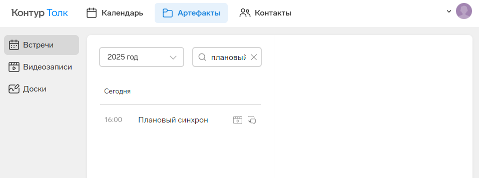 Артефакты — данные, связанные со встречей, которые хранятся в Толке. Артефакты встречи становятся доступными через несколько минут после отключения последнего участника от встречи.