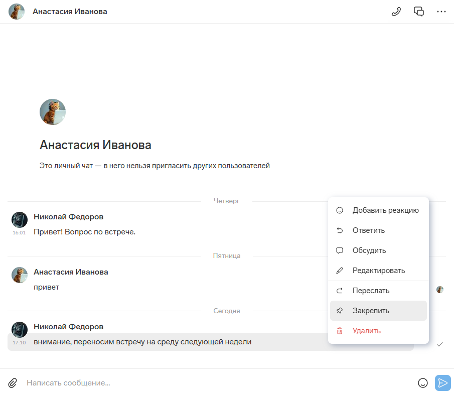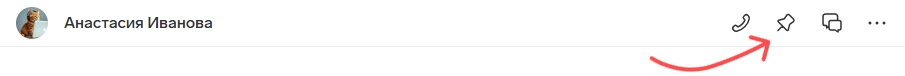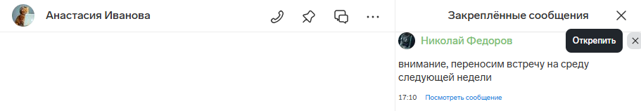 Любой участник может закрепить одно или несколько сообщений в чате. Для этого нажмите правой кнопкой мыши на строку сообщения и выберите «Закрепить».