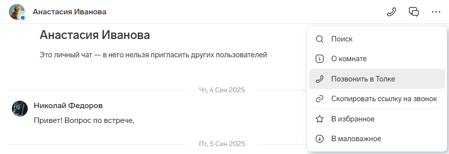 В личном чате можно позвонить собеседнику. После завершения оба участника чата смогут вернуться к видеозвонку и посмотреть артефакты.