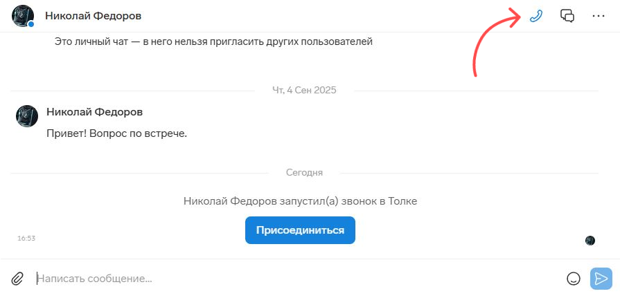 Чтобы подключиться к видеозвонку, который начал другой участник личного чата, нажмите «Присоединиться» или на значок вверху.