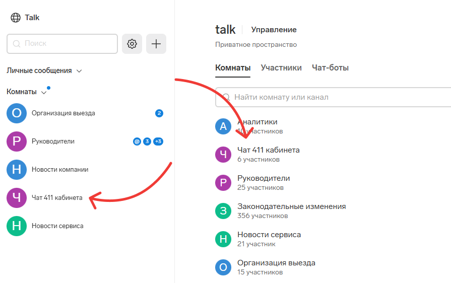 - Перейдите в нужный чат или канал, нажав на него в блоке «Комнаты» слева или на главной странице пространства.