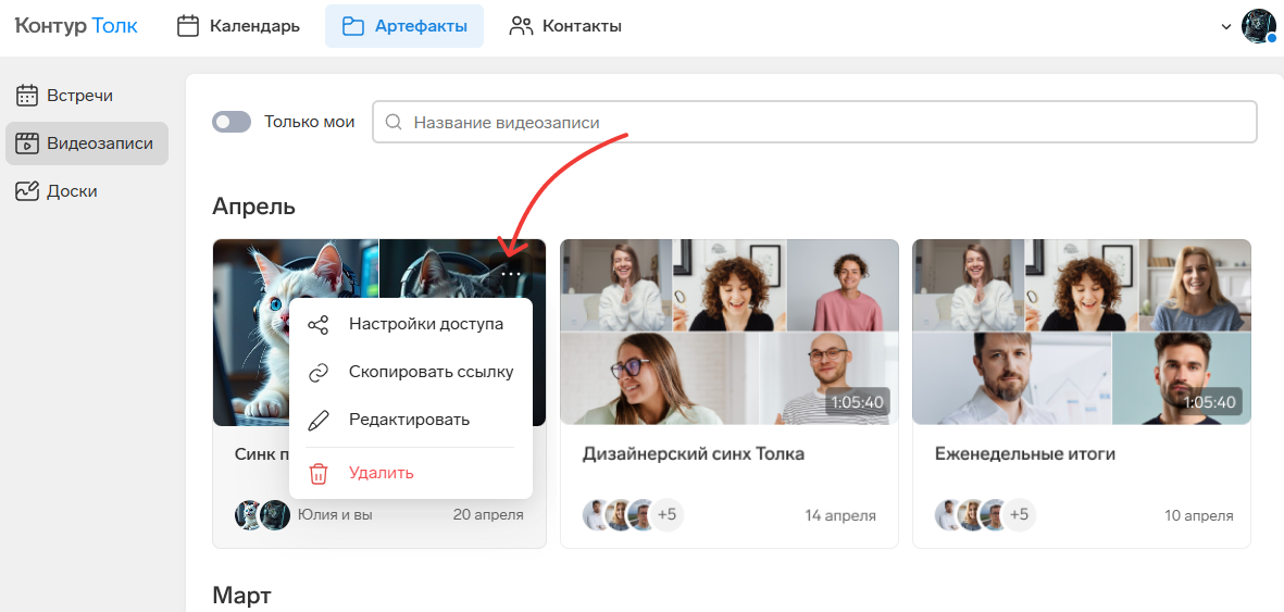 Облачная запись — это запись, которая хранится внутри Толка: в разделе «Артефакты» → «Видеозаписи».