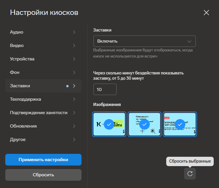- Отметьте в загруженных те заставки, которые нужно показывать в выбранных киосках. Можно выбрать не более 30 заставок.