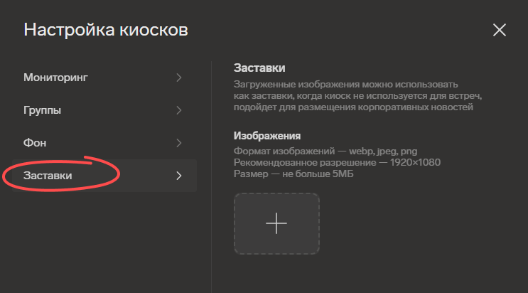 - Откроется окно настройки киосков. Перейдите в раздел «Заставки».