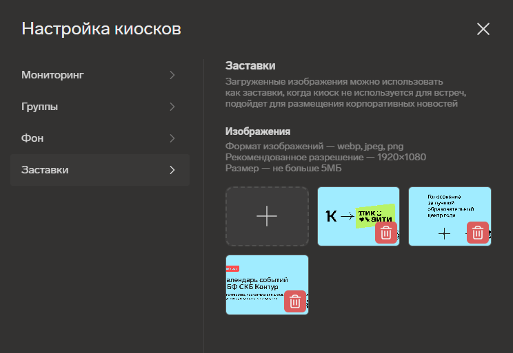 - Чтобы удалить изображение, нажмите на нем значок . Заставка удалится на всех киосках, где она используется.